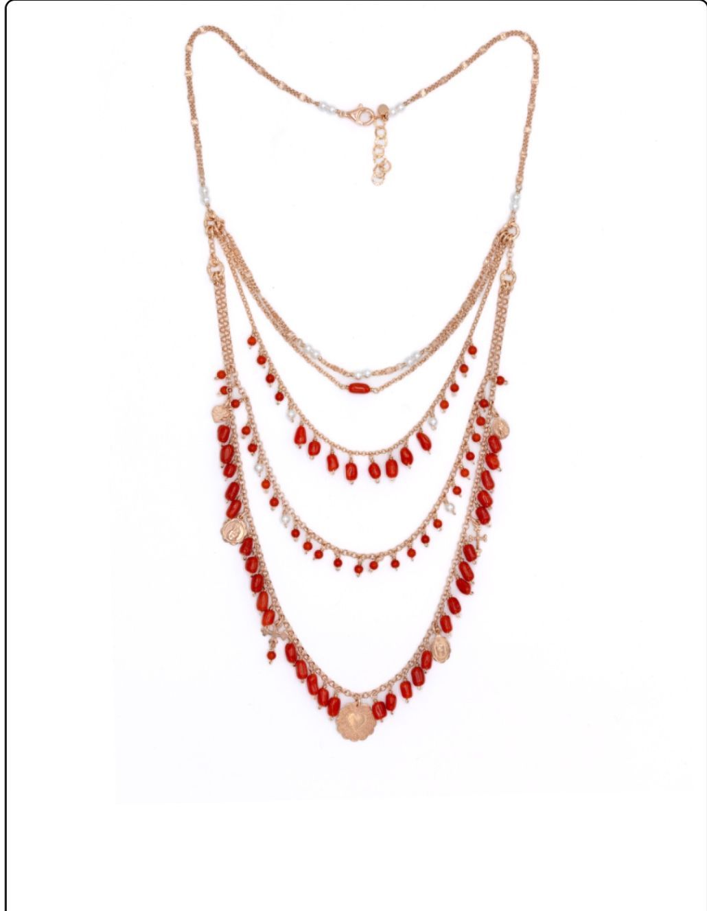 Collana multifilo in argento con galvanica oro rosa e pietre corallo. Indossando un’unica collana avrete un effetto vistoso, elegante e particolare